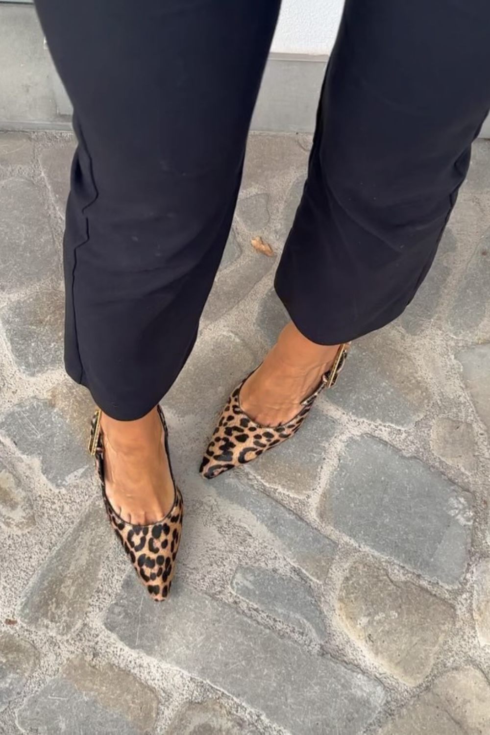 Beigefarbene niedrige Absätze mit Knöchelriemen und Schnalle, Leopardenmuster und spitzer Zehenpartie