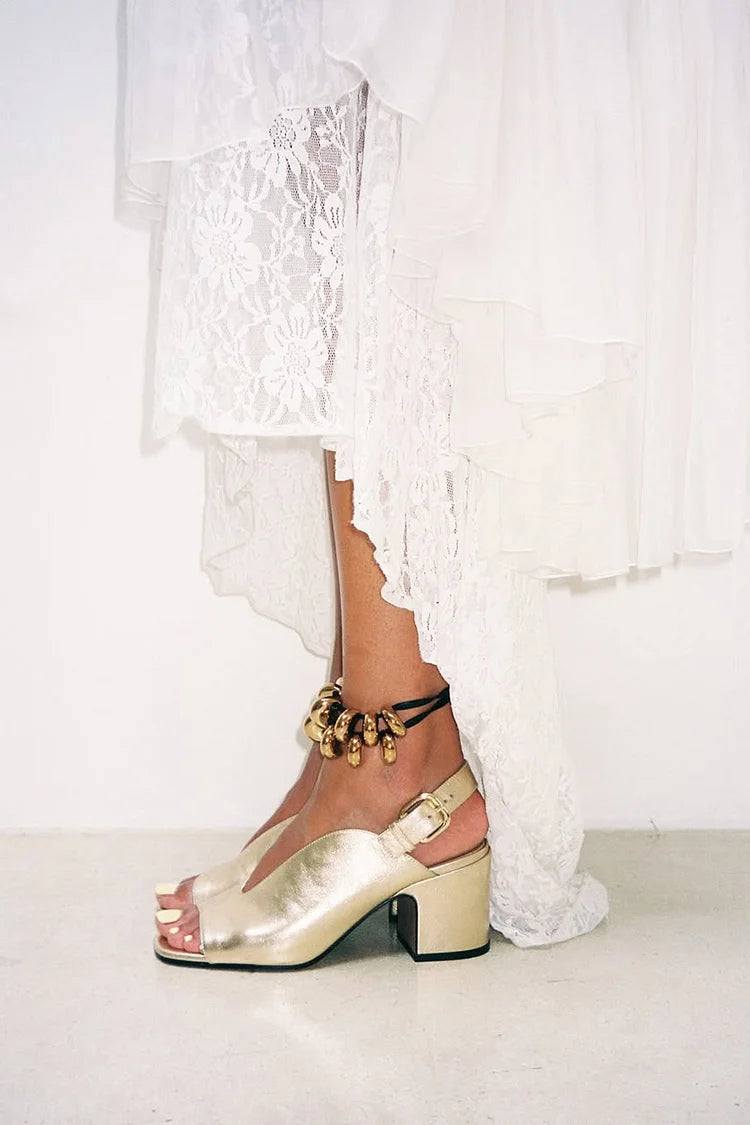 Metallischer Glanz V-förmige Rille Peeptoe Slingback Gold Klobige Absätze