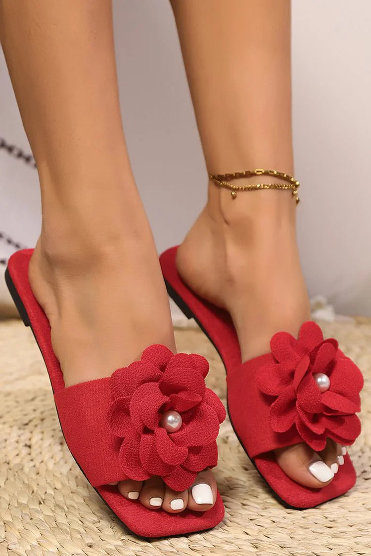 Pearl 3D Blumen Dekor Einfarbige Quadratische Zehen Strandpantoffeln