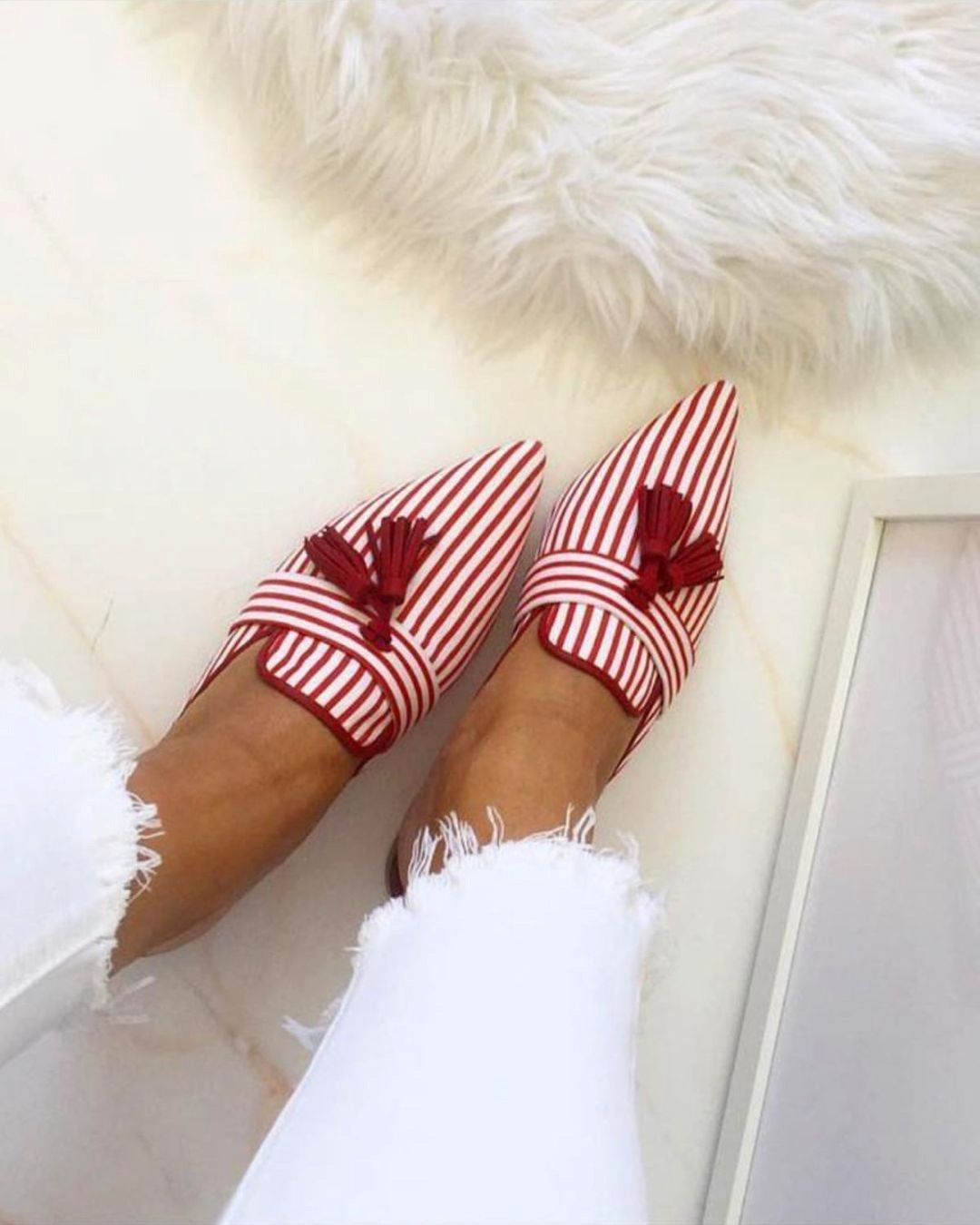 Rote und weiße gestreifte Fransen spitze Zehen lässige Ballerinas [Vorbestellung]