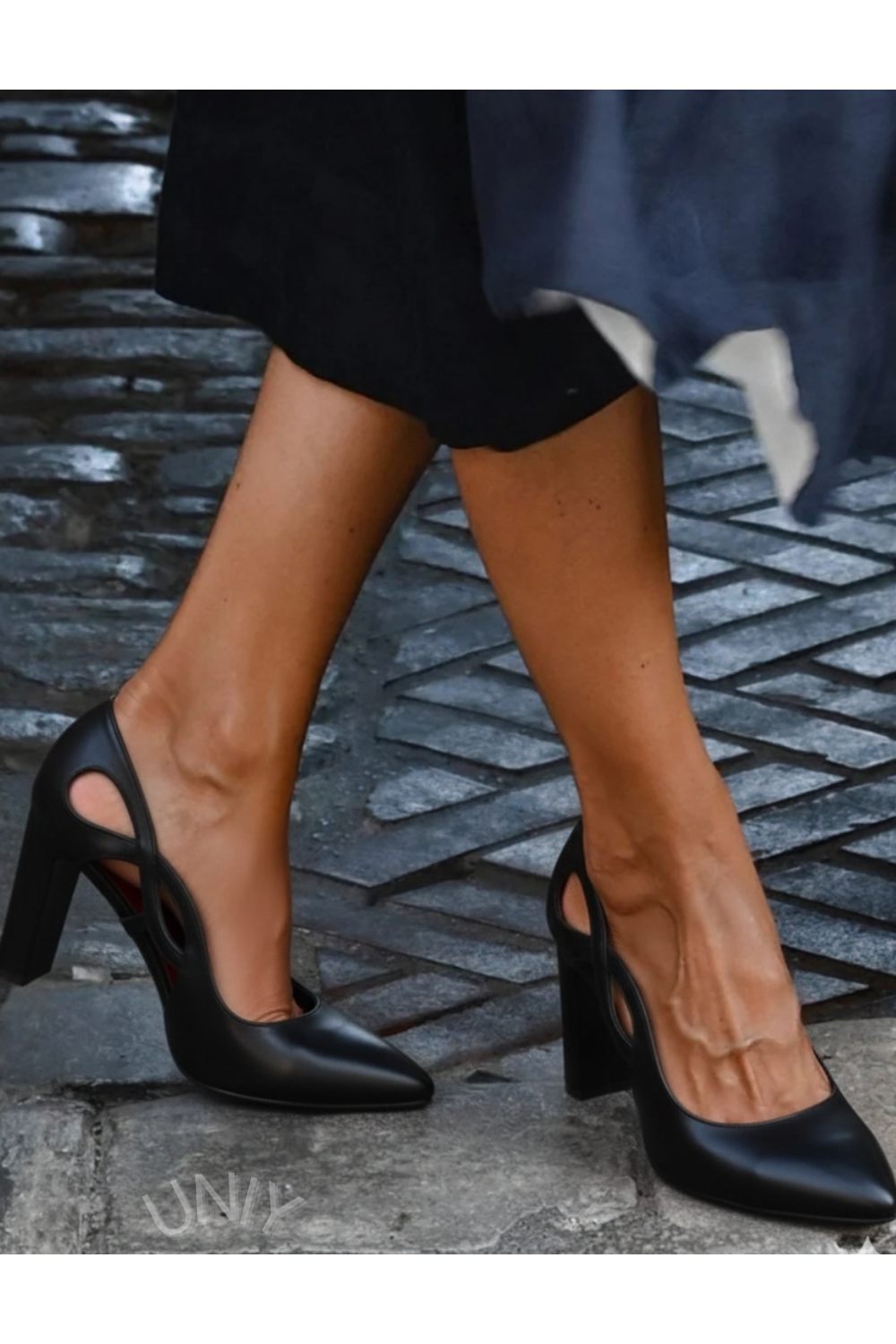 Seitliche Aussparungen Schwarze Leder Skulpturierte Absätze [Vorbestellung]