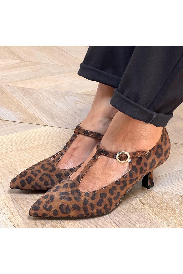 T-Riemen Schnalle Leopardenmuster Spitz zulaufende Zehen Braune Kittenabsätze [Vorbestellung]