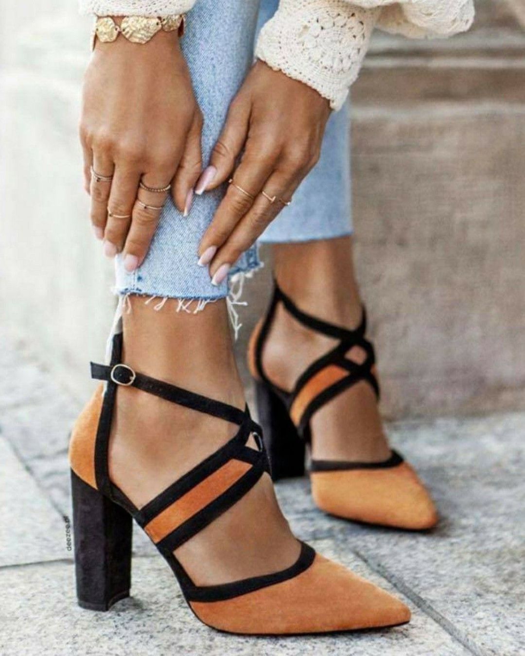 Vintage spitze Zehen, gekreuzte Riemen, Cutout, Colorblock, Blockabsätze [Vorbestellung]