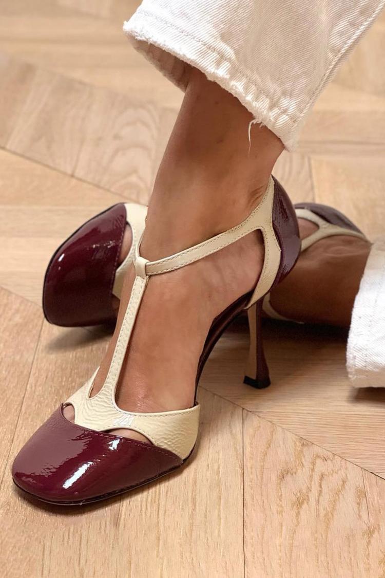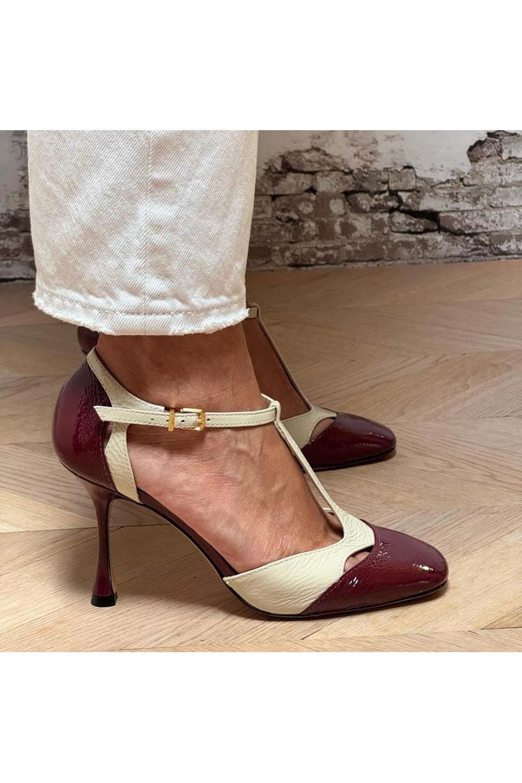 Zweifarbige T-Riemen Cut-Out Schnalle Burgunder Stiletto Absätze [Vorbestellung]