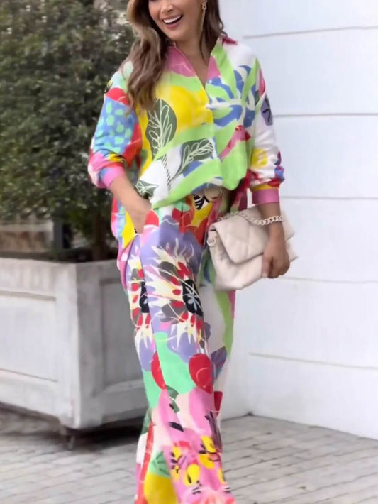 Ethnic Style Printed Loose Shirt High Waist Wide Leg Pants Suit