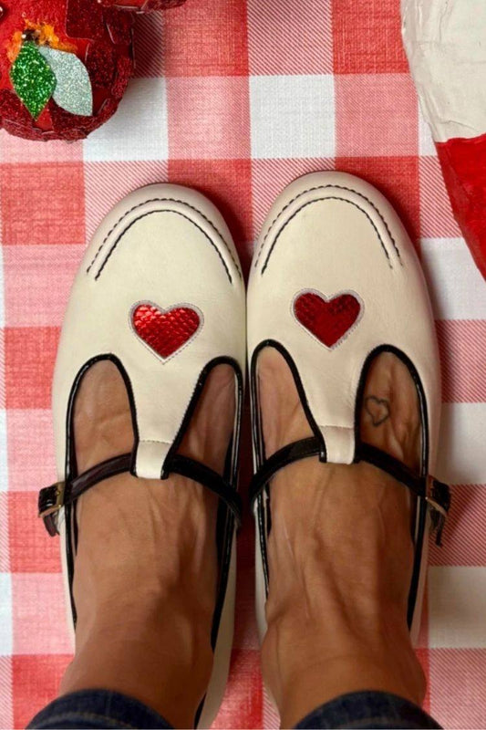 Cream Leather Heart Applique T-Strap Mary Jane Flats [Pre Order]
