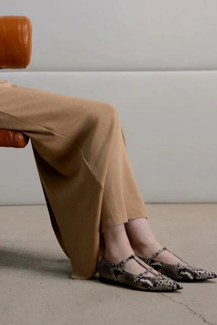 Snake Print Crossover Strap Buckle Pointed Toe Brown Flats [Pre Order]