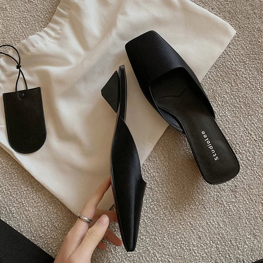 Elegant Plain Square Toe Satin Slides Triangle Heel Mules