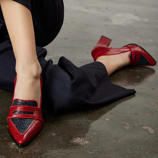 Colorblock Crocodile Pattern Pointed Toe Red Chunky Heels [Pre Order]