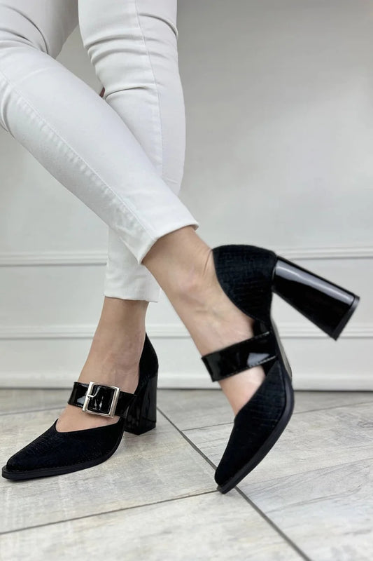 Crocodile Pattern Pointed Toe Black Chunky Heels [Pre Order]