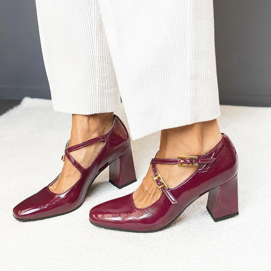 Cross Strap Buckle Square Toe Burgundy Chunky Heels [Pre Order]