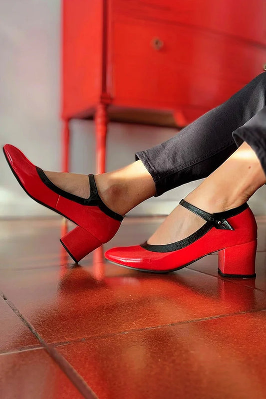 Contrast Color Instep Strap Buckle Red Chunky Heels [Pre Order]
