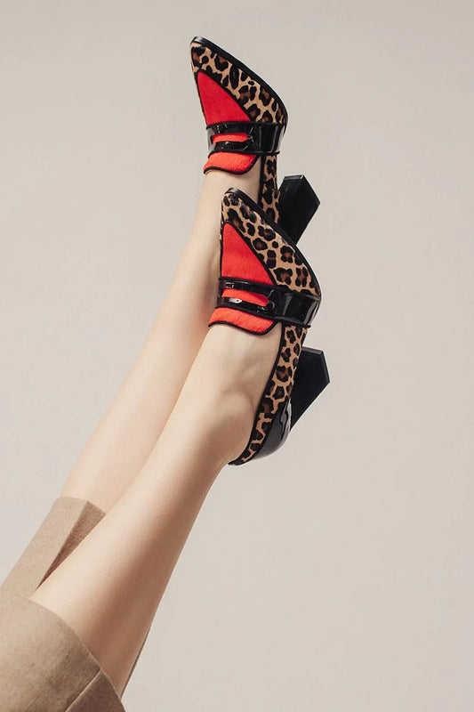 Colorblock Leopard Print Pointed Toe Khaki Chunky Heels [Pre Order]