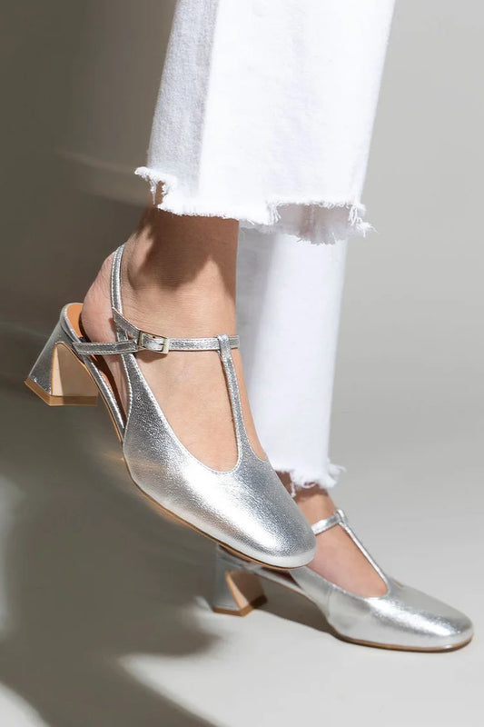 Solid Color T-Strap Buckle Slingback Silver Chunky Heels [Pre Order]