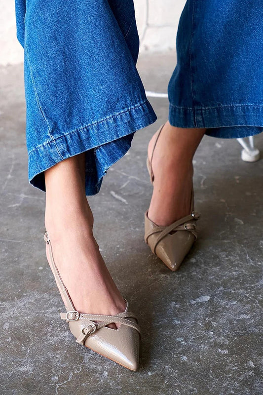 Trendy Cross Straps Buckles Slingback Pointy Toe Taupe Low Heels [Pre Order]