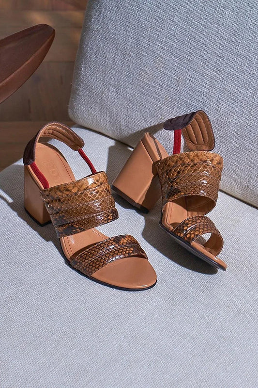 Distinguished Snake Print Open Toe Patchwork Brown Chunky Heels [Pre Order]