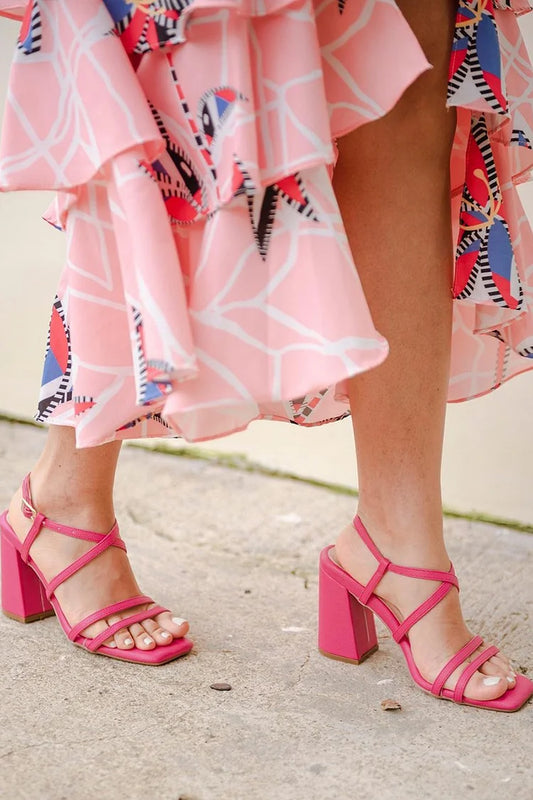 Strap Square Toe Crossover Plain Buckle Fuchsia Chunky Heels [Pre Order]