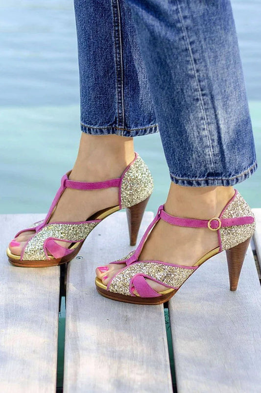 Sleek Contrast Color Glitter Fuchsia T-strap Buckle Cutout High Heels [Pre Order]