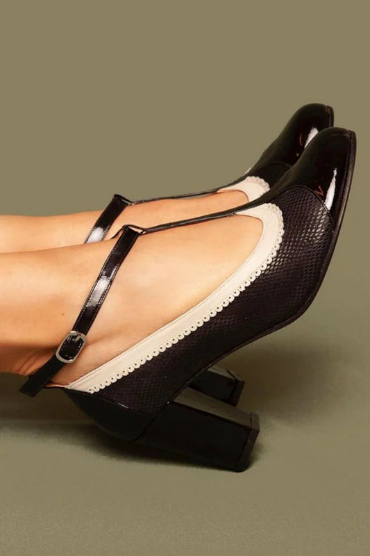 Textured Colorblock T-strap Chunky Black Buckle Heels [Pre Order]