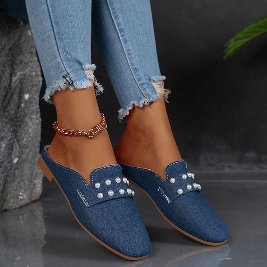 Pearl Beads Decor Solid Color Square Toe Canvas Mules