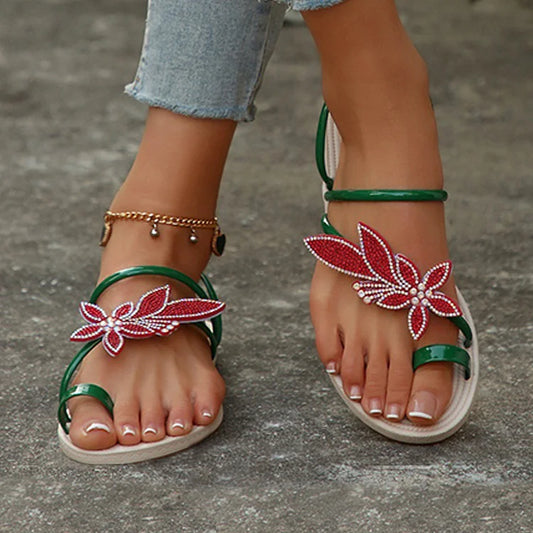 Rhinestone Flower Decor Toe Ring Casual Beach Sandals