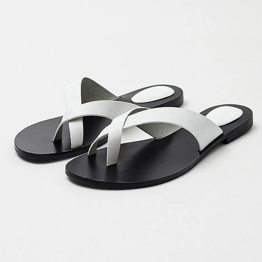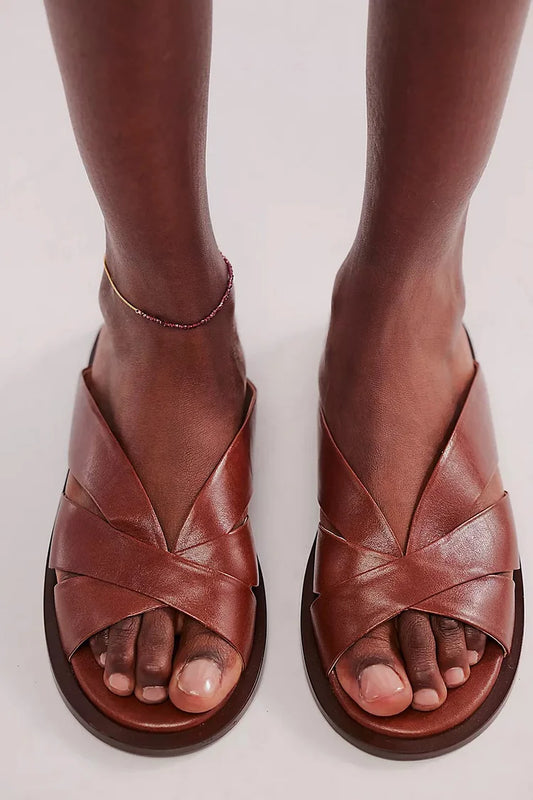 Cross Strap Round Toe Flip Flops Casual Leather Slippers