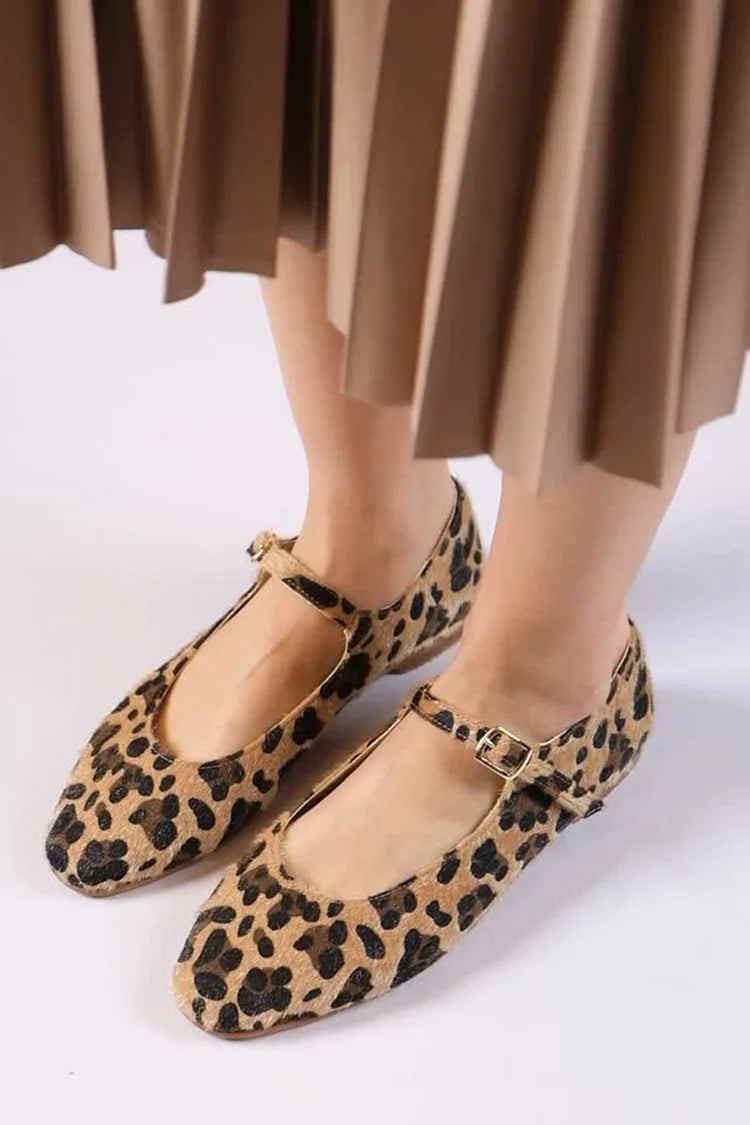 Leopard Print Instep Strap Buckle Light Brown Flats [Pre Order]