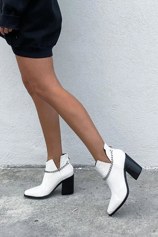 Metal Chain Decor Pointed Toe Chunky Heel White Ankle Boots [Pre Order]