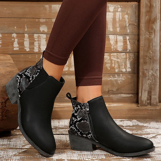Snake Print Round Toe Patchwork Chunky Heel Zipper Ankle Boots