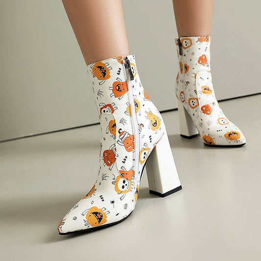 Halloween Pumpkin Skull Print Pointe Toe Chunky Heel Ankle Boots