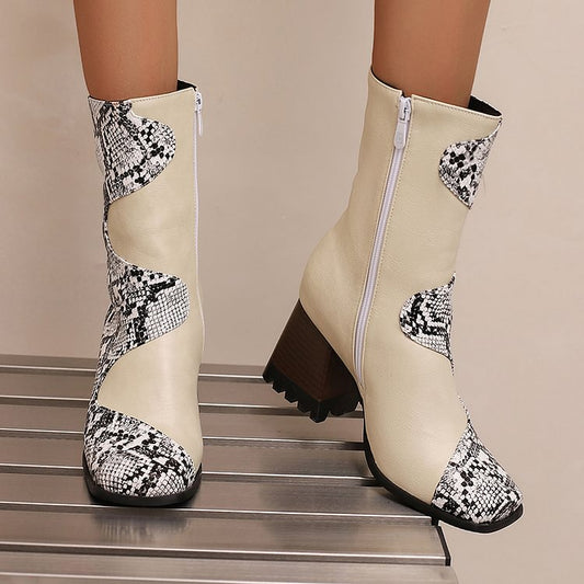 Snake Print Colorblock Chunky Heel Beige Ankle Boots [Pre Order]
