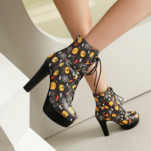 Halloween Scary Pumpkin Print Chunky Heel Lace Up Ankle Boots