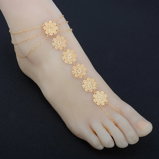 Boho Alloy Sculpture Flower Disc Layered Tassels Toe Ring Anklet
