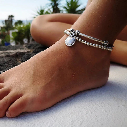 Boho Style Alloy Round Pendant Beaded Layered Anklet