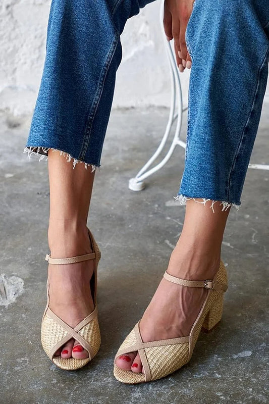 Woven Peep Toe Patchwork Beige Chunky Heels [Pre Order]