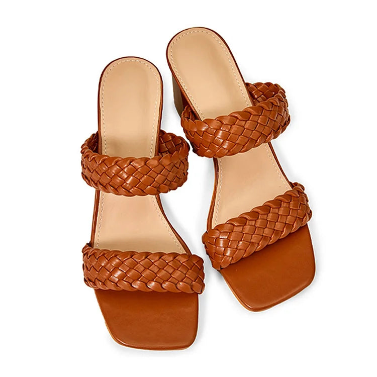 Woven Solid Color Square Toe Casual Sandals Chunky Heels