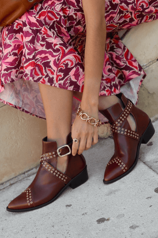 Vintage Studded Buckle Straps Pointy Leather Ankle Boots