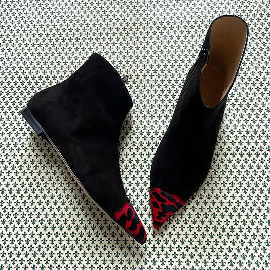 Leopard Print Patchwork Pointed Toe Black Ankle Boots [Pre Order]