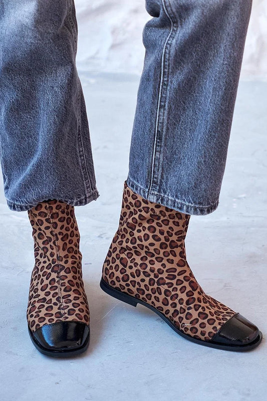 Patchwork Leopard Print Square Toe Brown Ankle Boots