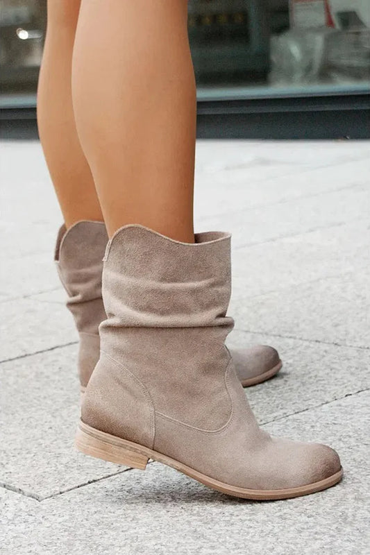 Solid Color Patchwork Pointed Toe Taupe Mid Boots