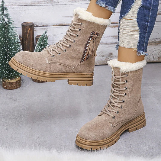 Patchwork Tassels Decor Faux Fur Lined Round Toe Lace Up Snow Boots