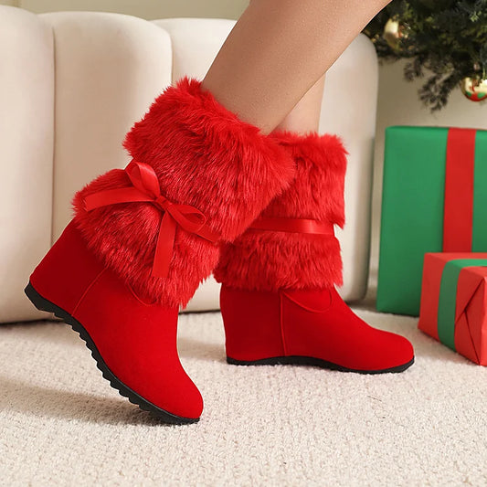 Christmas Fluffy Tied Up Bow Round Toe Wedge Heel Mid Boots