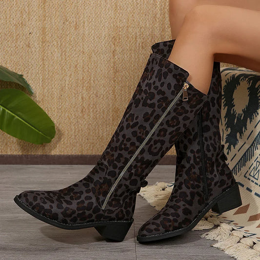 Leopard Print Zipper Pointed Toe Chunky Heel Mid Calf Boots