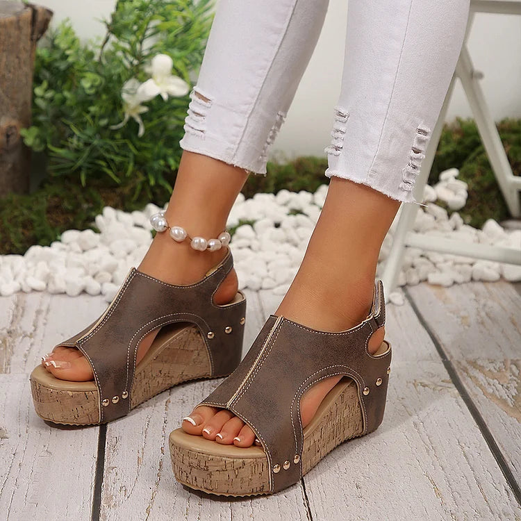 Leopard Print Cut Out Open Toe Metallic Studded Wedge Sandals