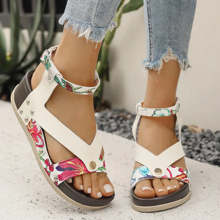 Patchwork Leopard Print Metal Rivets Round Toe Wedge Sandals