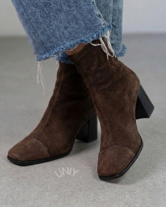 Solid Color Square Toe Chunky Heel Camel Ankle Boots [Pre Order]