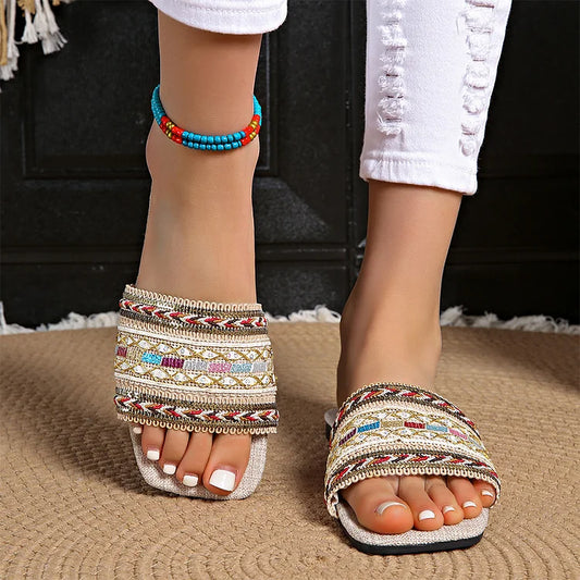 Zapatillas planas informales con punta cuadrada y estampado étnico para exteriores