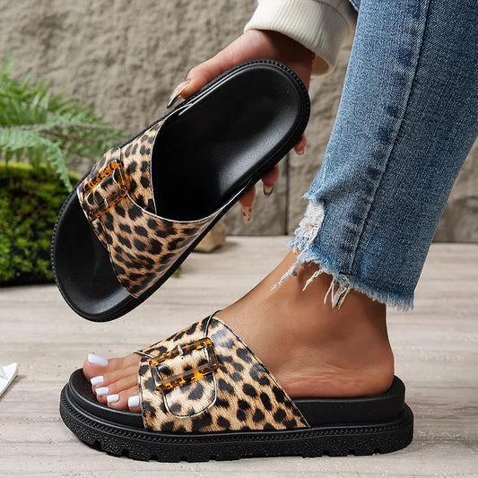 Pantuflas informales con plataforma, punta redonda, hebilla y tiras con estampado de leopardo