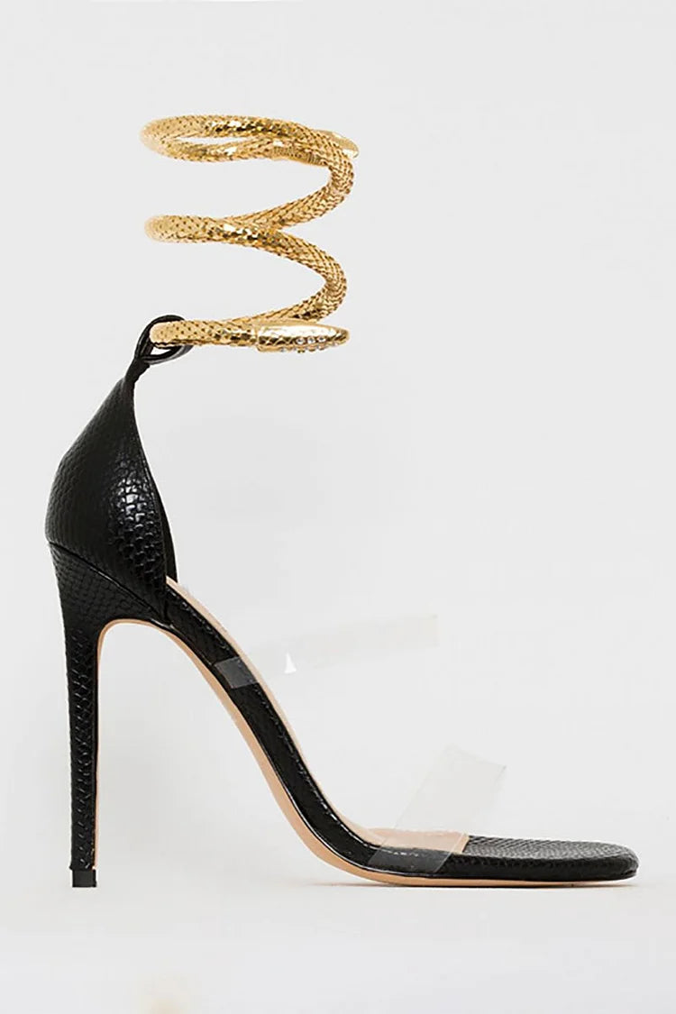 Sandalias de tacón de aguja con tiras transparentes en el tobillo y diseño de serpiente en dorado claro