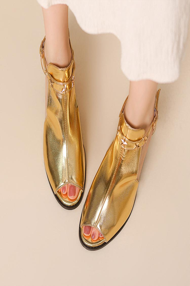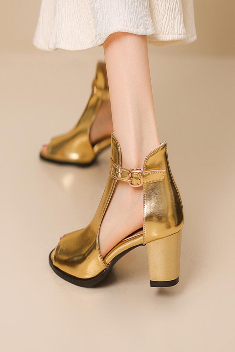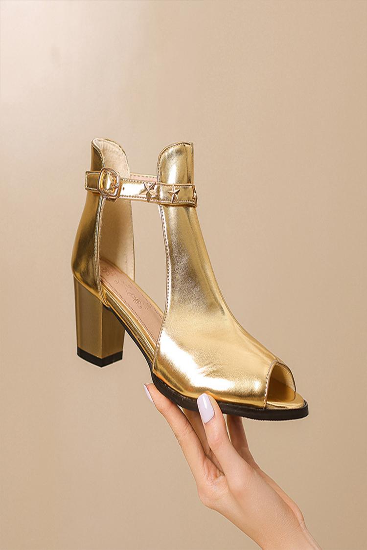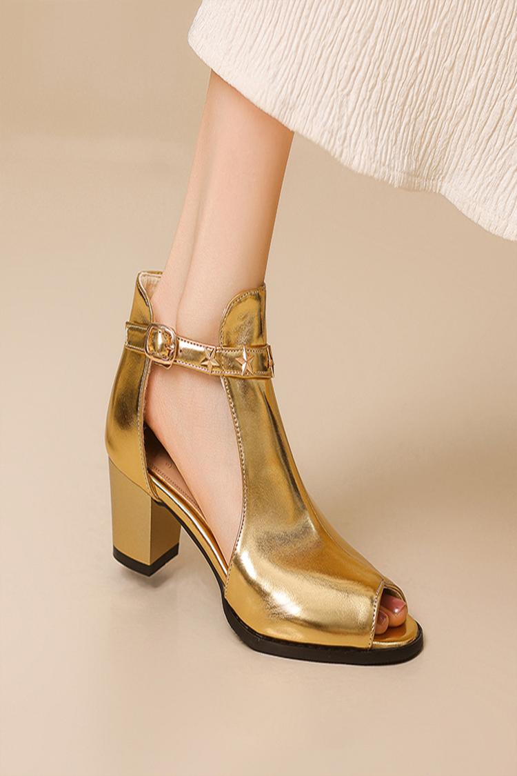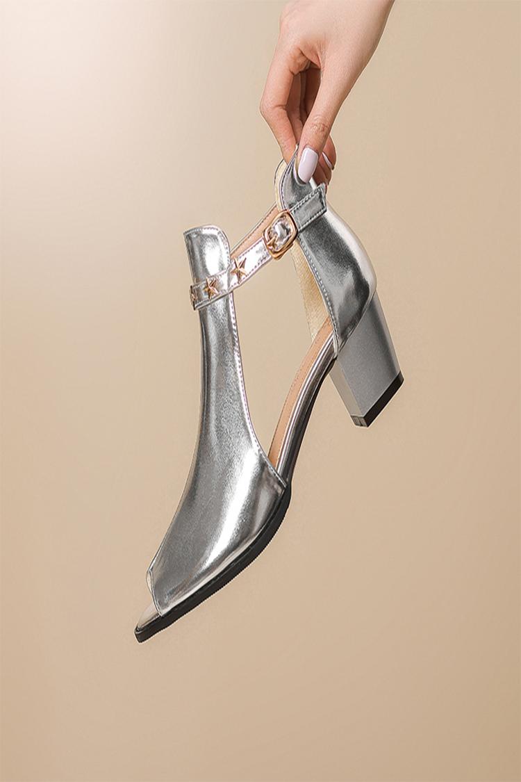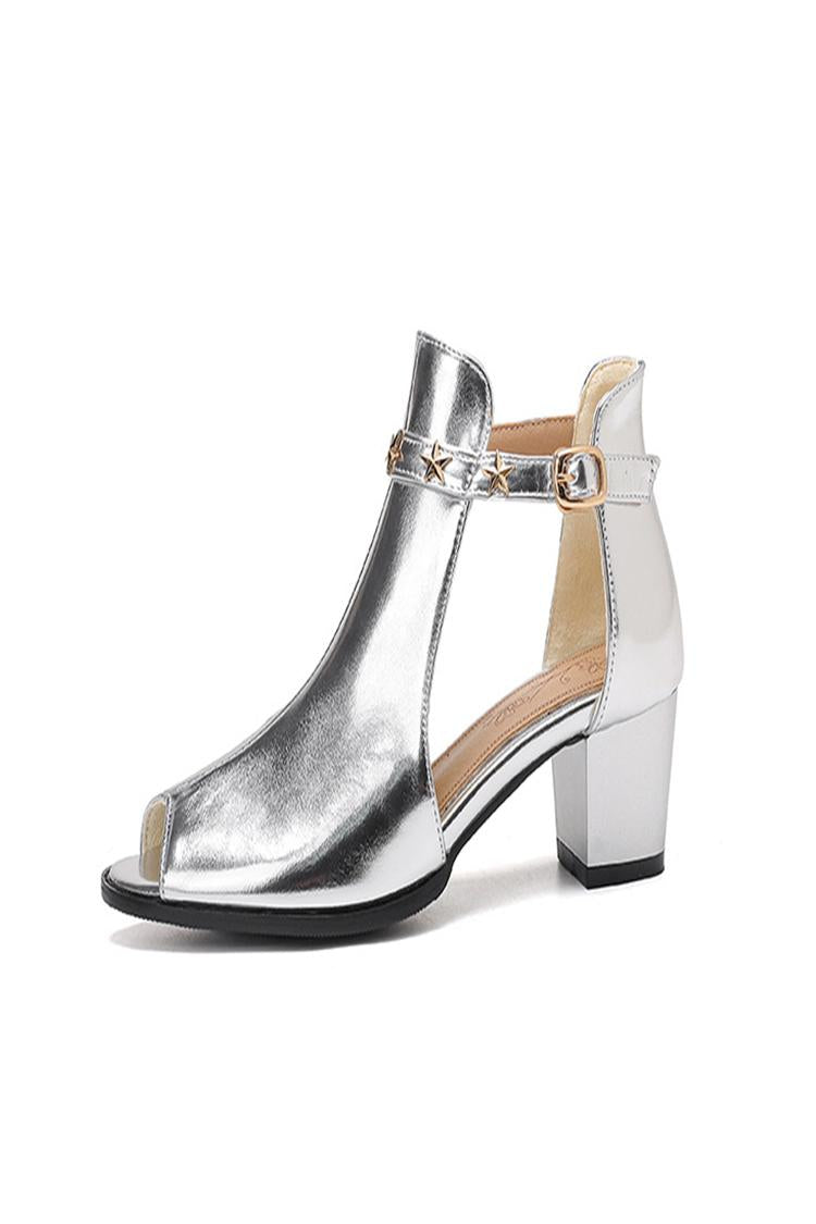Tacones gruesos con punta abierta y brillo metálico con hebilla y tiras en el tobillo con decoración de estrellas